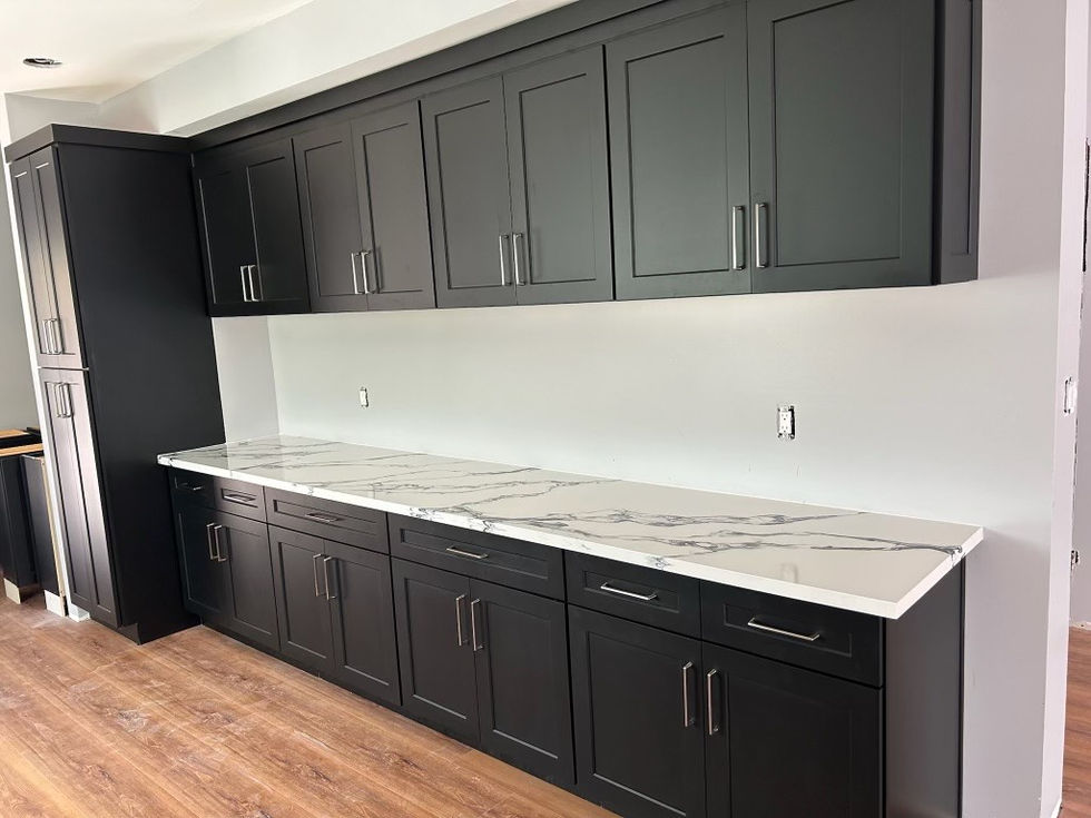 This project showcases modern kitchens with sleek black, dark, and gray cabinets, as well as marble countertops and wooden flooring.